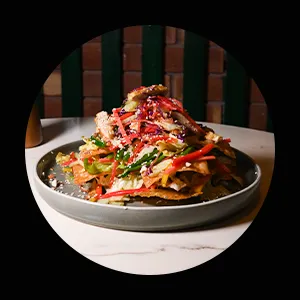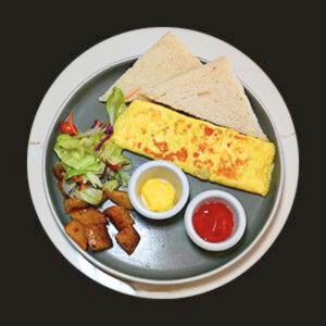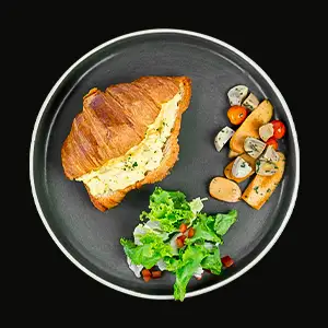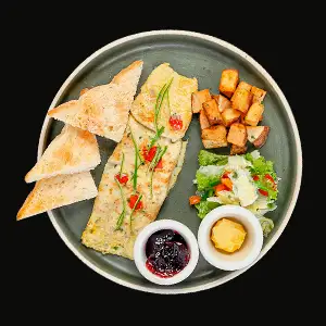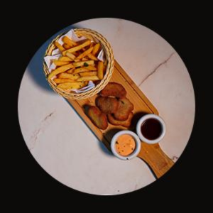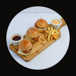 A heart-shaped bun brimming with marinated chicken and melted cheese, accompanied by baked potato wedges and a side of our signature sauce for a loving touch.